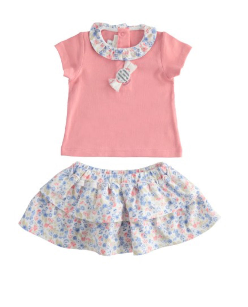 Compelto t-shirt di colore rosa e donna con fantasia floreale.