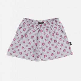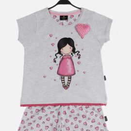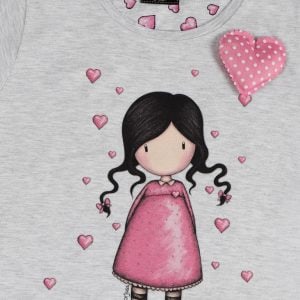 Maglia a mezza manica grigia con spacchi laterali e pizzo rosa al fondo della maglia. Bambolina con cuoricini al centro della maglia. Carinissimo cuore rosa a pois bianco applicato. Pantaloncino grigio stampato con tanti cuoricini rosa.