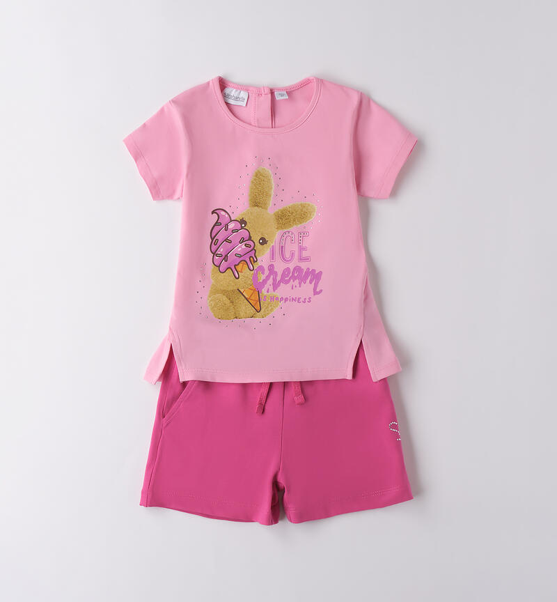 T-shirt con stampa, strass e spacchetti laterali. Pantalone corto con elastico in vita e coulisse.