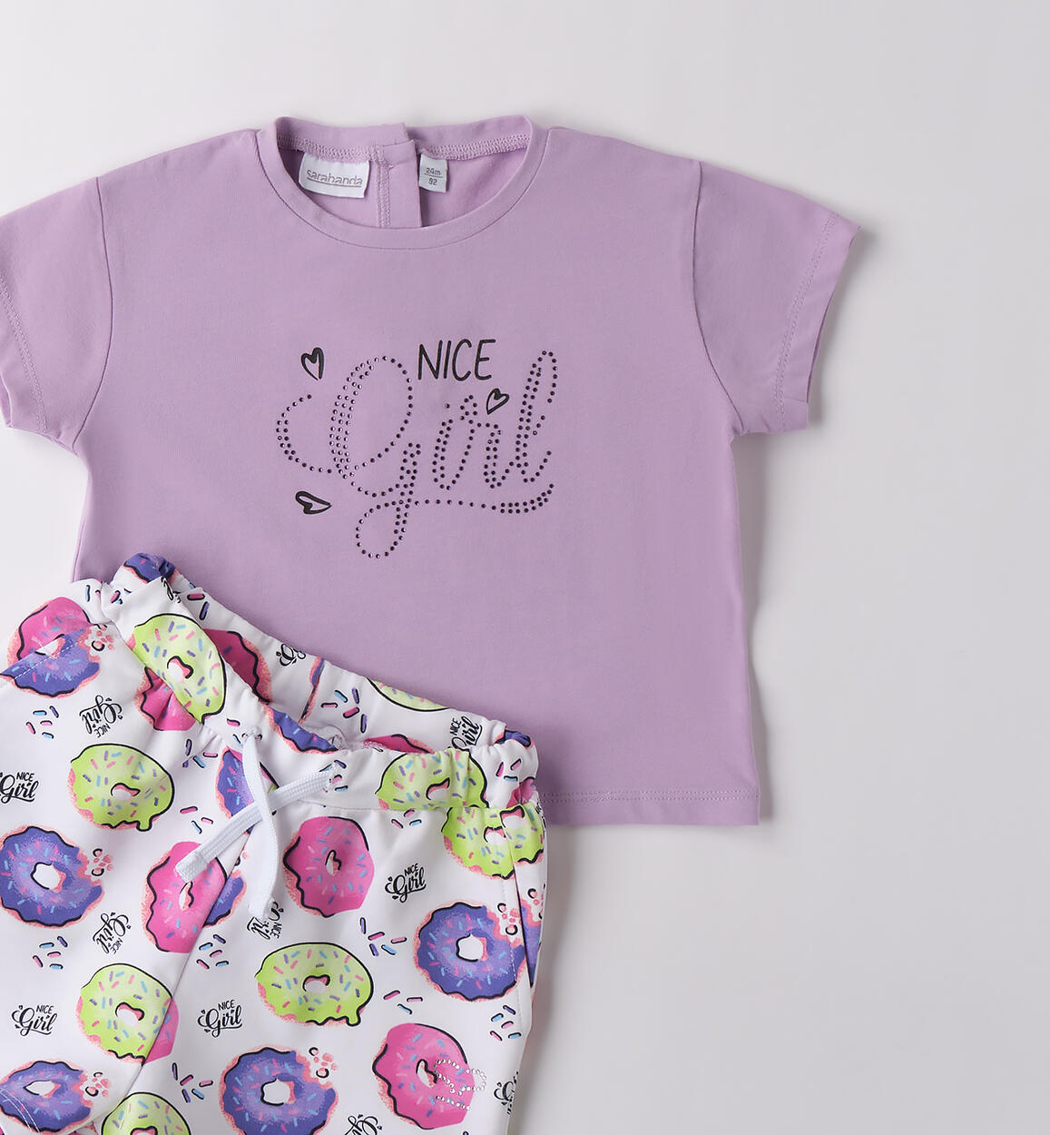 La t-shirt presenta apertura sul retro con bottoni e fantasia tinta unita. Gli shorts hanno vita elasticizzata e fantasia allover di donuts.
